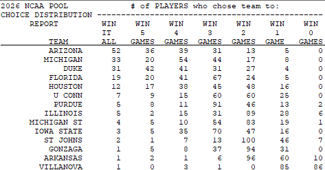 Since the last post table was ugly, here is a sniplet of the 14 teams people thought could be champion. #1 overall Duke picked by 31, good for third. Michigan was picked by 33.